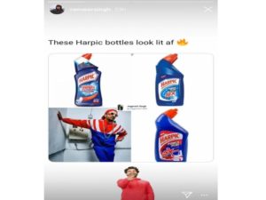 हाल ही में उन्होंने सोशल मीडिया ट्रोलर्स को जोरदार जवाब देते हुए अपने कपड़ों की टॉइलेट क्लीनर से तुलना करने वालाएक मीम इंस्टाग्राम पर शेयर किया। इस मीम में रणवीर कपूर लाल और नीले रंग के ट्रैकशूट में नजर आ रहे थे, जिसे टॉइलेट क्लीनर की तस्वीर के साथ जोड़कर उनका मीम बनाया गया था।