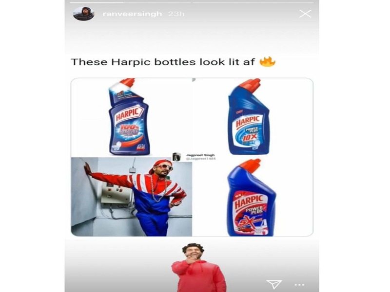 हाल ही में उन्होंने सोशल मीडिया ट्रोलर्स को जोरदार जवाब देते हुए अपने कपड़ों की टॉइलेट क्लीनर से तुलना करने वालाएक मीम इंस्टाग्राम पर शेयर किया। इस मीम में रणवीर कपूर लाल और नीले रंग के ट्रैकशूट में नजर आ रहे थे, जिसे टॉइलेट क्लीनर की तस्वीर के साथ जोड़कर उनका मीम बनाया गया था।
